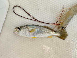 Eventually, some other boats arrived on the scene, and we exhausted our meager supply of bait. We headed in closer to shore, scanning for pelicans that might lead us to a fresh catch. This time, it didn’t take much effort. David’s first cast was perfect, landing about 20 more Menhaden. I was feeling more confident about casting one of David’s oversized nets (I’m used to casting a small net from shore, so this was a learning experience). I once again struck out on baitfish, but didn’t come up entirely empty-handed: trapped were a half dozen shrimp (either Northern White or Northern Brown Shrimp), a Southern Kingfish, and a juvenile Weakfish. The shrimp were keepers, and the other two went back. All were new species for me.